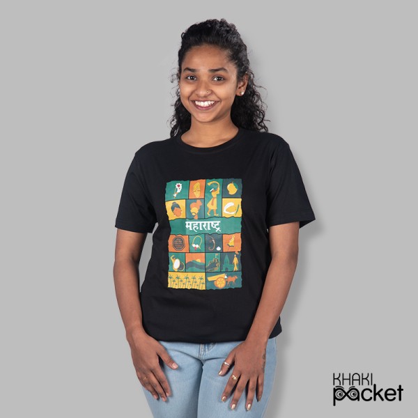A Maharashtra theme 100% cotton T-shirt is a shirt made of 100% cotton fabric and features a beautiful line art of Maharshtra. The shirt is lightweight, breathable, and comfortable to wear. The design includes popular landmarks, cultural elements and daily seen objects. The T-shirt is available in different colours.