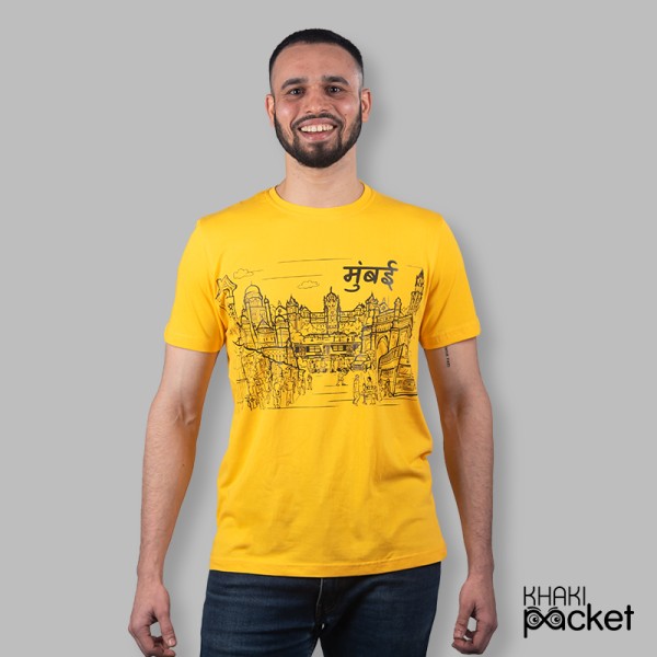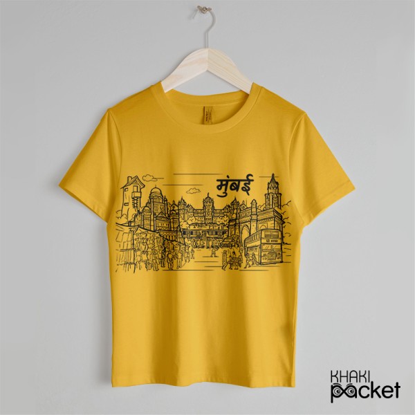 A Mumbai themed 100% cotton T-shirt is a shirt made of 100% cotton fabric and features a beautiful line art of Mumbai. The shirt is lightweight, breathable, and comfortable to wear. The design includes popular landmarks, cultural elements and daily seen objects. The T-shirt is available in different colours.