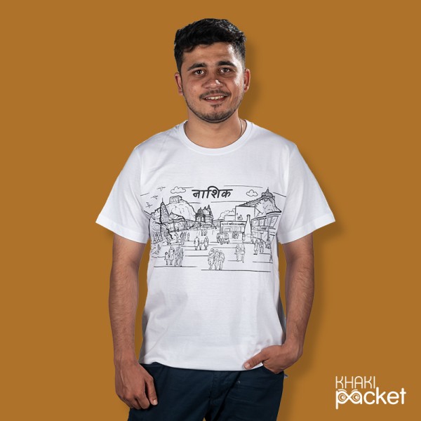 A Nashik theme 100% cotton T-shirt is a shirt made of 100% cotton fabric and features a beautiful line art of Nashik. The shirt is lightweight, breathable, and comfortable to wear. The design includes popular landmarks, cultural elements and daily seen objects. The T-shirt is available in different colours.