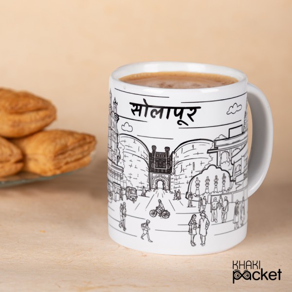 The Solapur City Mug is a ceramic mug featuring a detailed illustration of iconic landmarks and scenes from the iconic city-Solapur. The handle is comfortable to hold and the mug is microwave and dishwasher safe. The mug is a great gift for anyone who loves Solapur or is a fan of Indian culture. It's a perfect way to enjoy your morning cup of joy while reminiscing about your trips to the city or adding a touch of Indian culture to your daily routine. They are also popular souvenirs for visitors to Solapur.